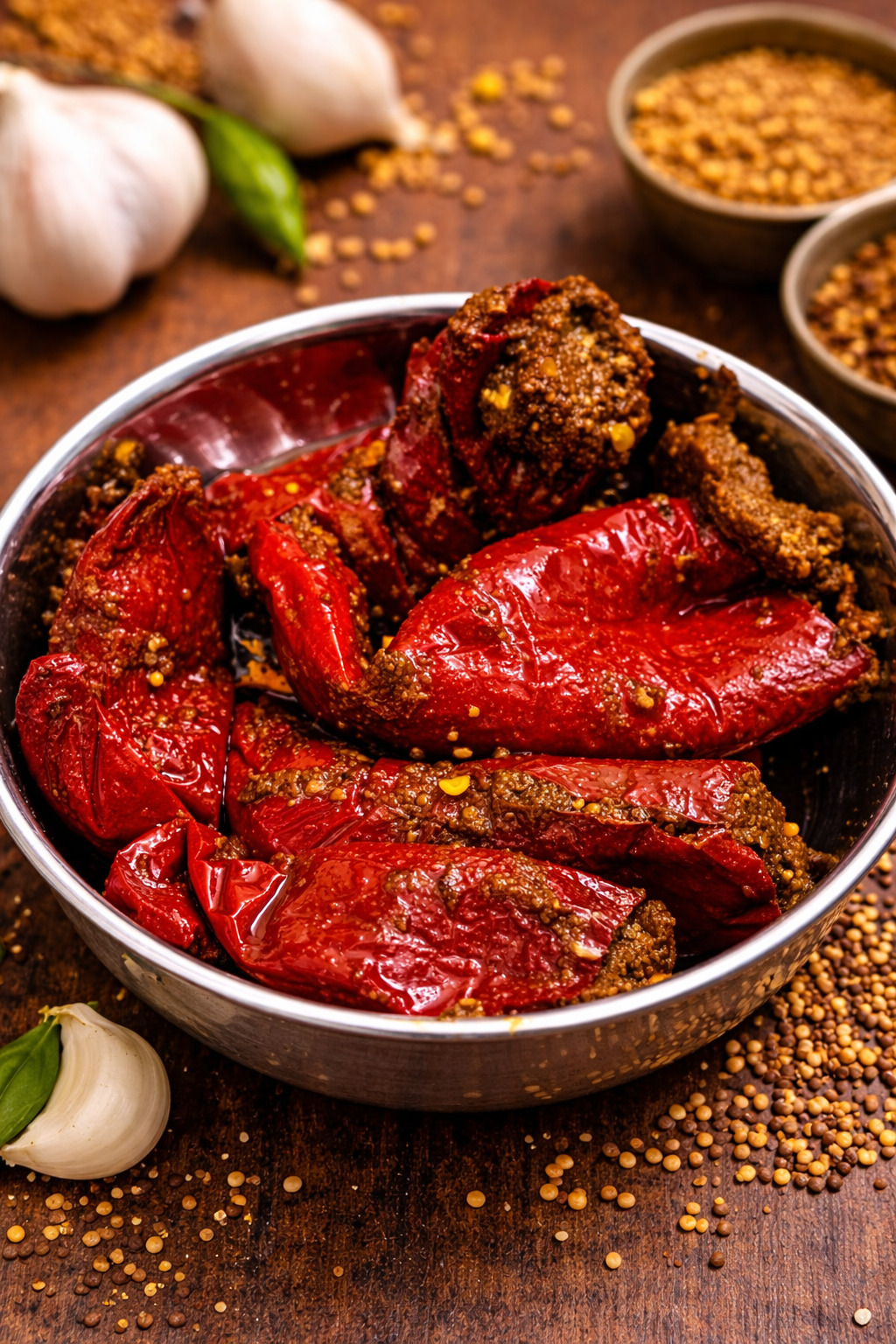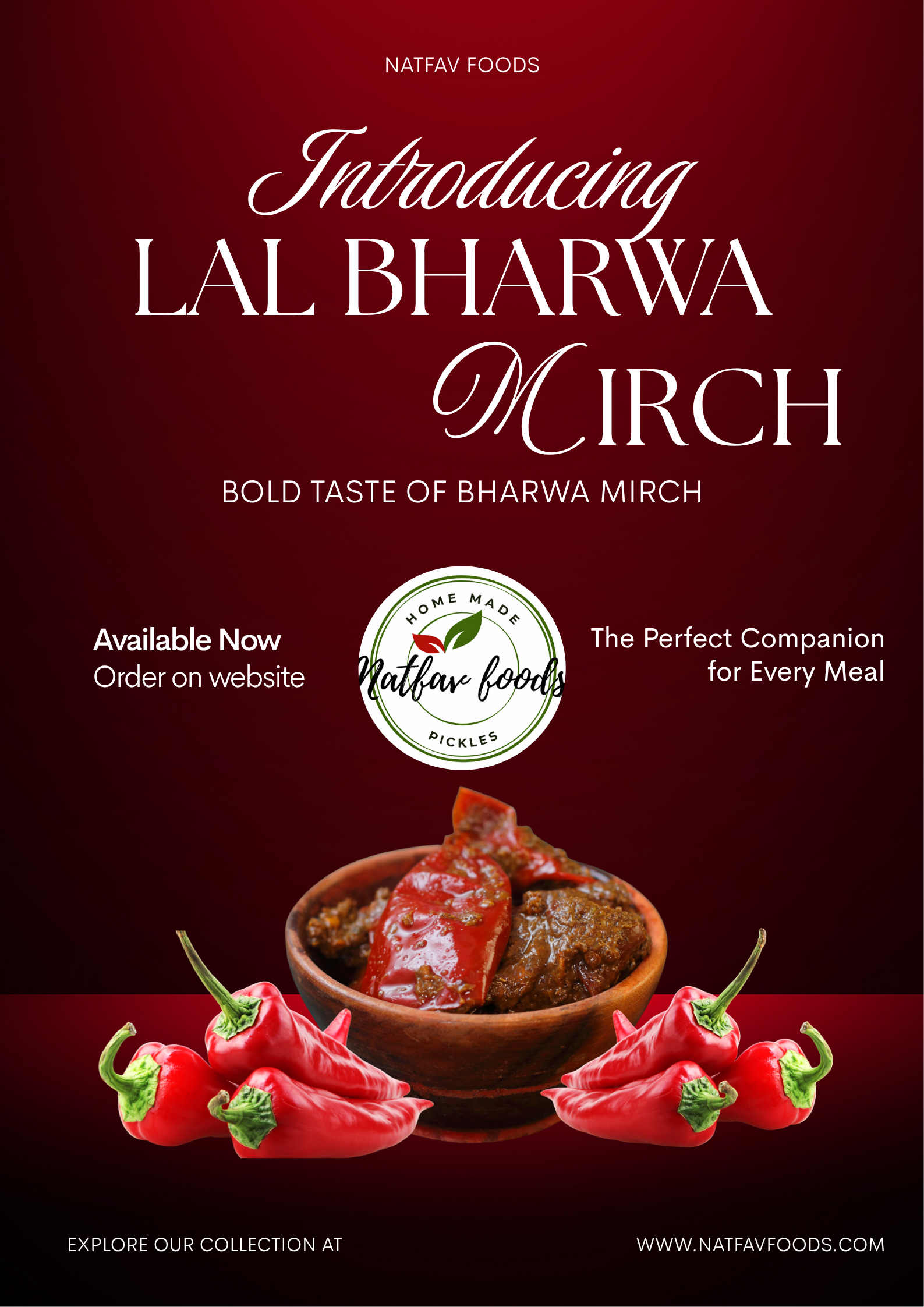 - Natfav Foods’ Lal Bharwa Mirch Pickle is crafted from carefully selected, plump red chilies, hand-cleaned and generously stuffed with a rich blend of traditional Indian spices.